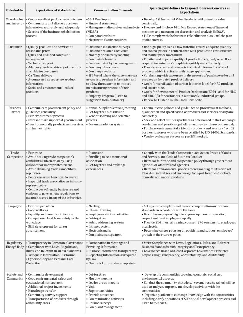 Sahaviriya Steel Industries Public Company Limited puts an emphasis on business value chain and divided the stakeholders into 7 groups:  1) Shareholder and investor, 2) Customer; 3) Business partner; 4) Trade competitor; 5) Employee 6) Regulatory entity, and 7) Society and community. Any impacts to the stakeholders shall be managed by the Company’s responsible agencies.
